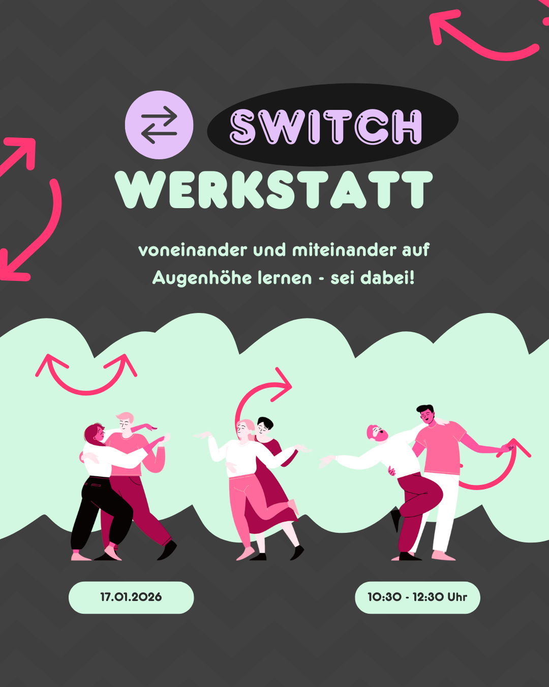 In der Switch-Werkstatt gibt es nicht eine Person, die alle anderen unterrichtet; alle Teilnehmer*innen profitieren voneinander, zeigen sich gegenseitig, was sie kennen, erproben neue Moves, und sprechen über das, was ihnen wichtig ist. Wir moderieren die Veranstaltung und überlegen uns eine Struktur, gehen aber gerne flexibel auf euch ein und freuen uns auf einen offenen und regen Austausch, mit Anmerkungen, Ideen und Beiträgen von möglichst vielen!