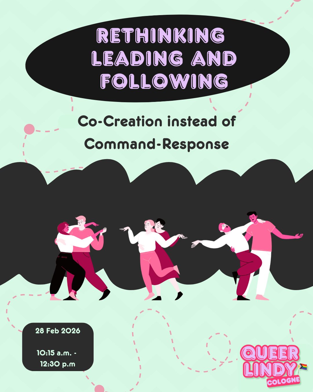 In this workshop, we want to reflect on, experience, and collectively explore lead-follow dynamics. Although dance roles in Lindy Hop are increasingly degendered in class settings, we still frequently encounter fairly heteronormative patterns on the dance floor and in lessons: female-presenting followers who only dance what the male-presenting lead decides. This not only undermines the follower's initiative but can also put leaders under immense pressure, making them feel they must constantly "deliver" and carry sole responsibility for the dance. Letβs join together to explore how we can fill both roles with newfound freedom and view the dance as a collaborative project where both sides play an active part in the creation.